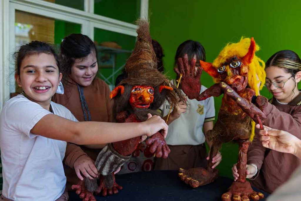 De la mano de los propios estudiantes, los muñecos cobraron vida gracias a la imaginación y espontaneidad infantil, generando un diálogo entre tradición y creatividad. La experiencia se completó con un taller creativo que se desarrolló en el patio del museo. Allí, los alumnos plasmaron en dibujos sus propias interpretaciones de los personajes mitológicos del monte misionero, reforzando con su imaginación el vínculo entre lo ancestral y su propia expresión artística.