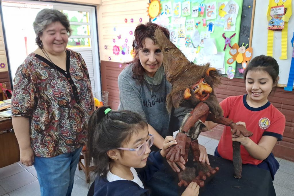 La primera parte de la charla está a cargo de Nora Morales, licenciada en Historia y apasionada por la Arqueología y la mitología del pueblo guaraní. Posteriormente, aparecen en escena unas marionetas emulando al Yasy Yateré y al Pombero, que motivan a la realización de títeres de mano, en una actividad de sensibilización que lleva adelante la artista plástica Cecilia Azcue. Durante la charla, los chicos escucharon con atención los relatos, y aportaron sus anécdotas a la clase. Luego, se acercaron con curiosidad a los muñecos y pusieron manos a la obra para construir su propio títere.