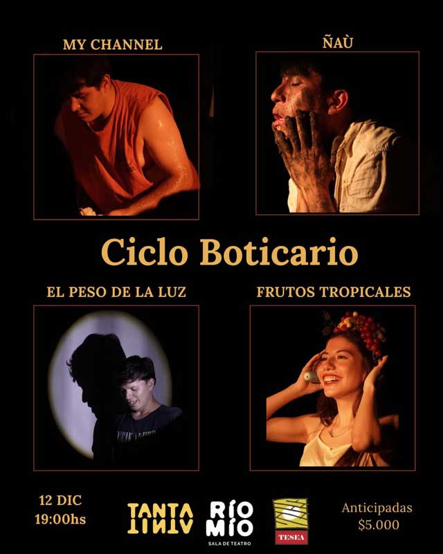 Boticario es un ciclo de micropoéticas escénicas, compuesta por cuatro trabajos producidos por los alumnos de la Tecnicatura Superior en Actuación de la Escuela Normal de Posadas. Es una invitación a ver el arte como un acto curativo, dónde el cuerpo recuerda y la palabra florece entre luces, sombras, historias y belleza.