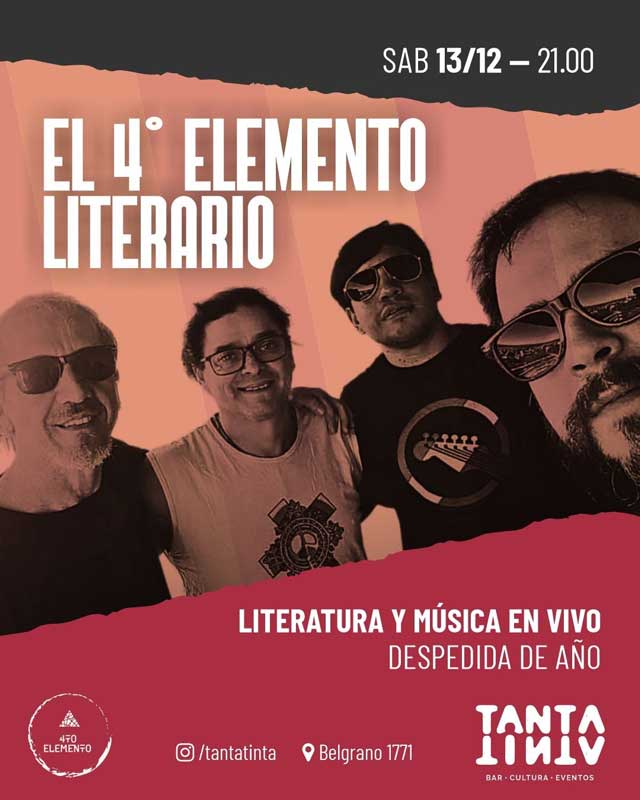 Para despedir el año con literatura y música en vivo, se presenta la banda 4° Elemento y los amigos del Encuentro Literario. Con barra de tragos será una noche para celebrar la cultura.