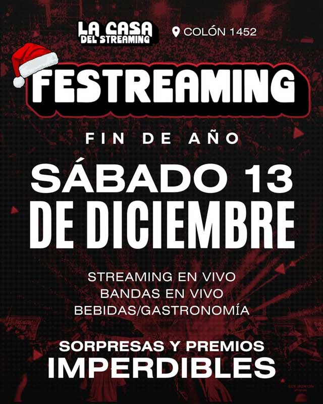 El sábado se corta la calle Colón de Posadas y se prende la Festreaming. Bandas en vivo, stands de comida y bebida, juegos, premios y un streaming que va a dar que hablar. Cerramos el año como se merece: en modo fiesta y buena vibra. Se presentan Caramba, Andy Gaona, Ale Rodríguez, Los Foras y Xergio King