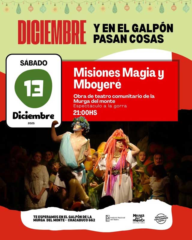 Última presentación del año de la obra de teatro comunitario de la Murga del Monte, Misiones Magia y Mboyeré. Basada en el argumento de Sueño de una Noche de Verano, de William Shakespeare, la obra se llena de duendes locales y anclajes en la realidad obereña.