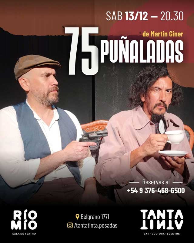 75 puñaladas trata sobre un misterioso crimen investigado por un enviado de Scotland Yard: el joven detective John Kenneth Winslow III. ¿Quién podría ser el culpable? ¿Por qué no hay sangre en el lugar?, se preguntará el detective. Una comedia negra de Martin Giner. Producción de Silvina Warenycia, Agua de Río, actúan Matías Pintos y Richar Vera, dirige Alejandro Scholler.