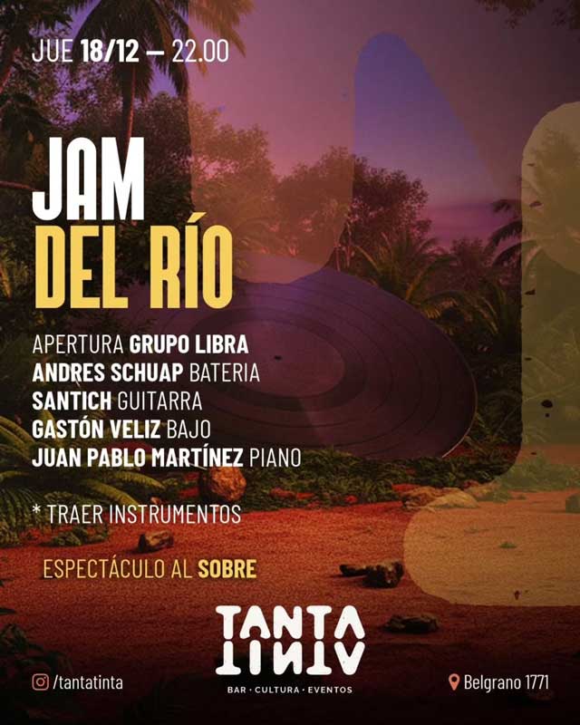 Una nueva edición de la JAM del Río con el Grupo Libra y después se abre el juego. Podés llevar tu instrumento y sumarte a una noche de música y ganas de compartir. Estarán disponibles equipos, piano y batería.