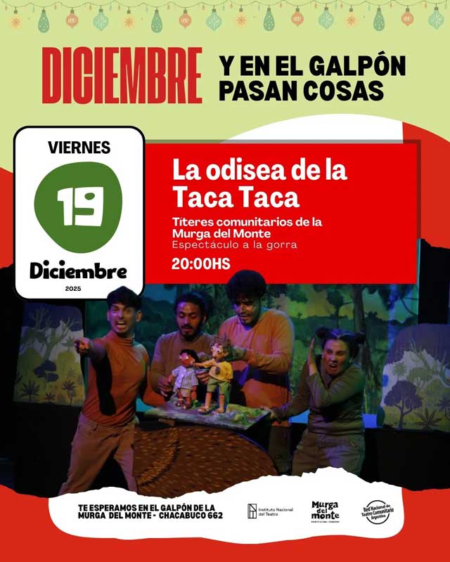 Última función del año de La Odisea de la Taca Taca en el galpón de la Murga del Monte. En la obra de los títeres comunitarios, un grupo de niñes, Rulo, María y Emilio, se anima a entrar al monte en busca de la Taca Taca mágica para ayudar a su amigo Cucu a vencer los miedos. Entre risas, canciones y aventuras descubrirán que la verdadera magia está en la amistad.