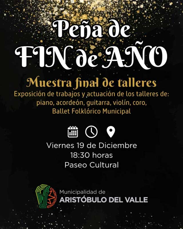 La Municipalidad de Aristóbulo del Valle invita a compartir la muestra final de los talleres municipales. Se expondrán trabajos y se realizarán presentaciones de piano, acordeón, guitarra, violín, coro y el Ballet Folklórico Municipal.