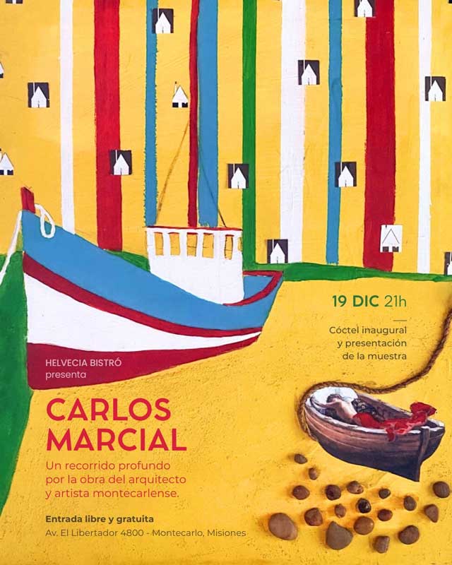Para celebrar la vida y trayectoria de Carlos Marcial, se realiza una muestra retrospectiva de su obra, llena de colores, texturas y simbolismo. La selección de trabajos incluye piezas de concursos de dibujo y pintura galardonadas y publicadas en medios como Clarín, El Territorio y la Revista Hábitat.