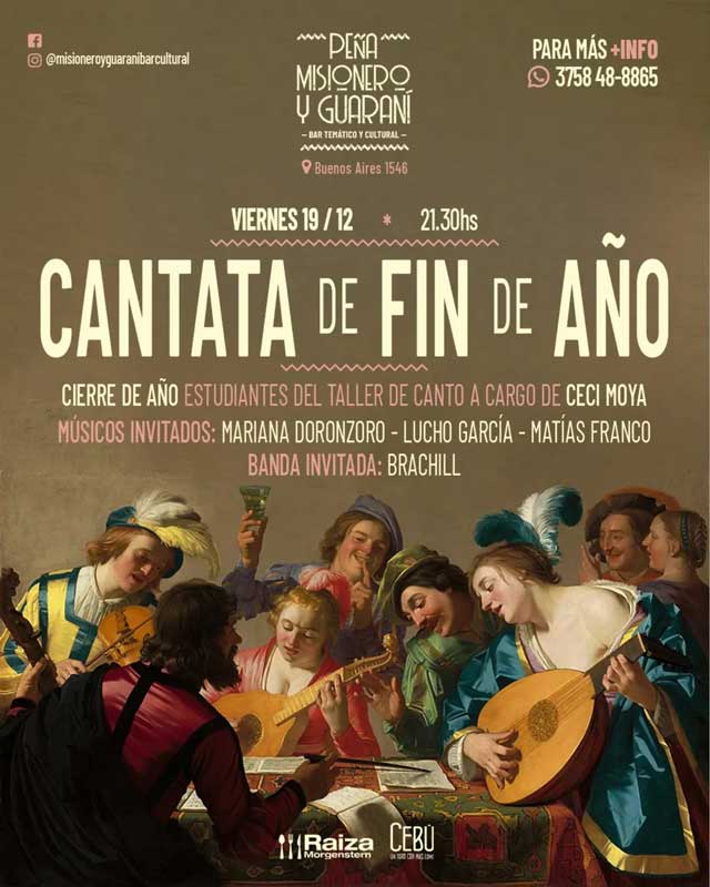 Los estudiantes del taller de canto de Ceci Moya, cierran el año en Misionero y Guaraní. Será un momento para compartir sonidos, voces, música y emoción. Músicos invitados: Mariana Doronzoro · Lucho García · Matías Franco. Banda invitada: Brachill