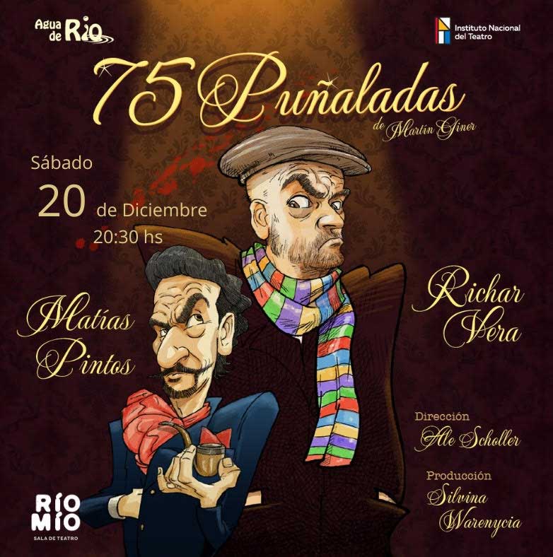75 puñaladas trata sobre un misterioso crimen investigado por un enviado de Scotland Yard: el joven detective John Kenneth Winslow III. Una comedia negra de Martin Giner. Producción de Silvina Warenycia, Agua de Río, actúan Matías Pintos y Richar Vera, dirige Alejandro Scholler.
