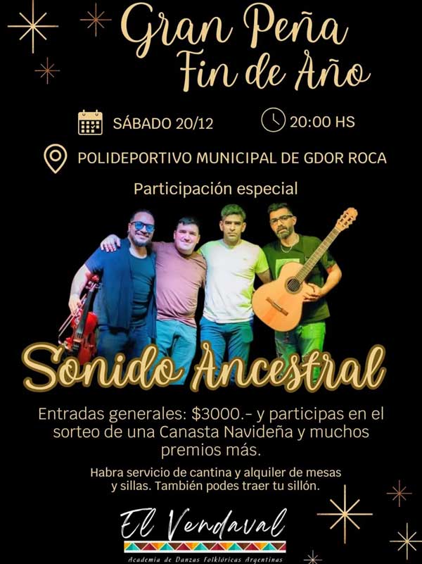 ¿Quién dijo que el folklore es aburrido? Bailes, música y diversión asegurada al ritmo de Sonido Ancestral para finalizar el año. Con servicio de cantina y posibilidad de llevar sillones para mayor comodidad.