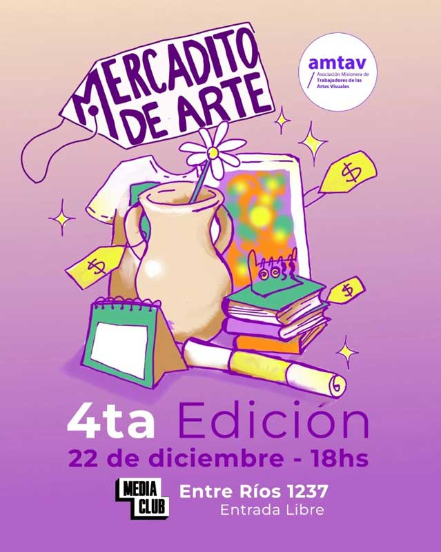 Una nueva edición del Mercadito de arte de la Asociación Misionera de Trabajadores de las Artes Visuales en colaboración con Mediaclub. Artistas de distintos puntos de la provincia ofrecerán obras de pequeño y mediano formato a precios accesibles; ambientada con musiquita de TuGuaina, tragos refrescantes y un espacio para charlar y compartir con los expositores.