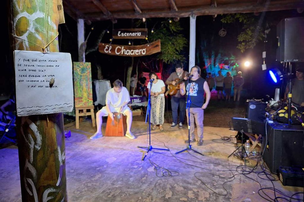 En la oportunidad, los dueños de casa, Cacho Villalba y Silvana Zimmermann Giura, quisieron imponer el nombre de “El Chacrero” al escenario que se ubica en una de las esquinas del gran quincho que es el corazón cultural del camping. “Cuando recién empezábamos a perfilar este sueño, había una persona que siempre estaba y que siempre decía que sí a nuestras propuestas”, dijeron, segundos antes de descubrir el cartel con su nombre.