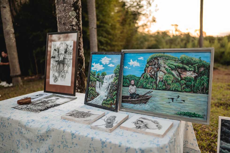 De la zona de exposición y venta de piezas participaron artistas como Walterius Rex, Luis “Lucho” Cubillas, la Biblioteca Popular Patricias Argentinas y un stand de libros de autores misioneros. Al otro lado del espacio de la casa de madera, el escultor Chino López daba los últimos cortes y terminaciones a una obra realizada en un tronco de anchico, recuperado de la tala ilegal. La pieza, que formará parte de la exposición permanente del Museo, es una alegoría del cuento “A la deriva” de Horacio Quiroga. Refleja una serpiente que rodea una gran hinchazón sobre una canoa, conteniendo así los elementos centrales del relato, como los remos y una botella de caña. Por distintos acuerdos, en el marco de las obras de mejora del predio, la escultura se finalizará con un pedestal para evitar la humedad del suelo y materiales de protección de la madera.