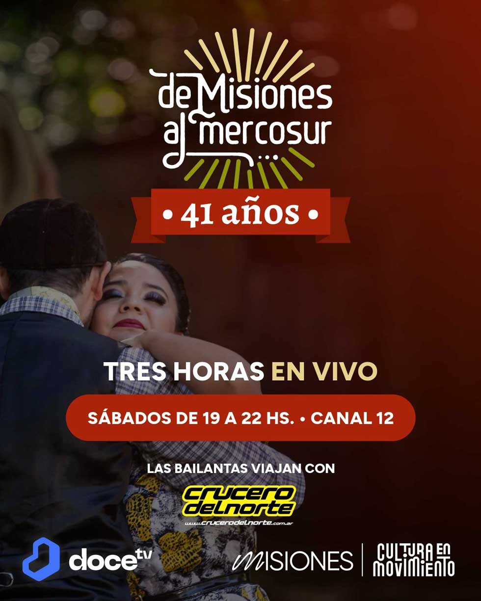 Con apoyo en la producción de la Secretaría de Estado de Cultura de la Provincia, “De Misiones al Mercosur” apuesta a la difusión de la música regional con especial énfasis en la participación de artistas folklóricos locales, siempre en contacto directo con la comunidad. La propuesta, que el año pasado celebró su cuadragésimo aniversario, se ha consolidado como un clásico de los sábados, llevando el folklore misionero a miles de hogares y generando un espacio de encuentro para las bailantas de toda la provincia.