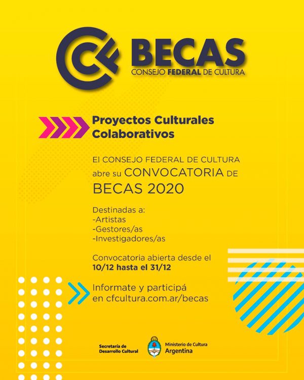 El Consejo Federal De Cultura anuncia la convocatoria 2020 del Programa Anual De Becas para Proyectos Culturales Colaborativos, destinadas a artistas, gestores/as e investigadores/as, cualquiera sea la disciplina o sector cultural. Es una beca por provincia por un monto de ($120.000.-) y la convocatoria finaliza el 31/12/2020 Con la finalidad de facilitar el acceso para…