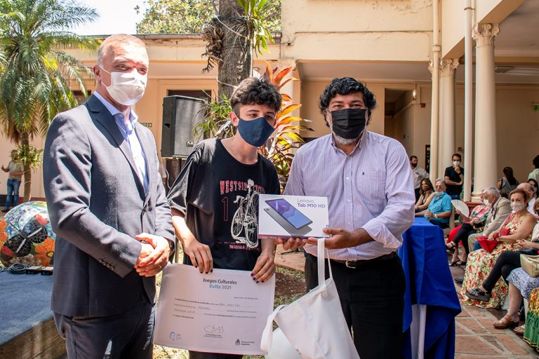 Ayer en la mañana en el patio de Casa de Gobierno se hizo entrega de medallas y tablets a los primeros puestos de los Juegos Culturales Evita 2021,…