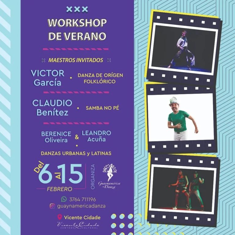 Los profesores Berenice Oliveira y Leandro Acuña, directores de Guaynamérica Danza, junto a los Maestros invitados, Víctor García en Folklore y Claudio Benítez, en Danzas Brasileñas, dictarán un…